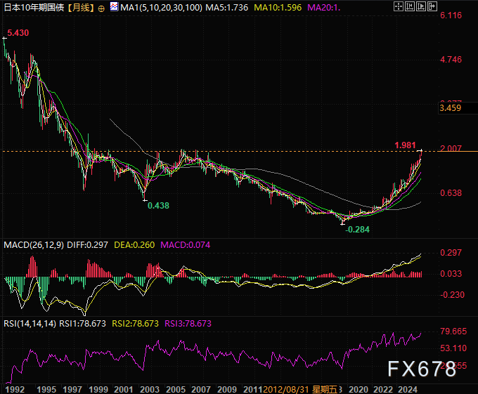 2%这一水平过去25年始终是日债收益率的标志性上限,收益率近期的暴涨向市场释放出日本“失去的数十年”通缩周期退场的明确信号——自1990年代日本“泡沫经济”破裂后,10年期日债收益率仅在2006年5月10日短暂冲高至2.005%,其余时间均处于该水平下方。